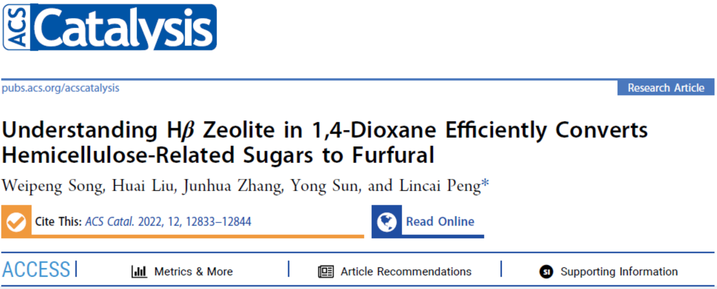 生物质化工团队关于半纤维素高效催化转化选择性制备平台化学品糠醛的最新研究成果“Understanding Hβ zeolite in 1,4-dioxane efficiently converts hemicellulose-related sugars to furfural”在美国化学会催化领域旗舰期刊《ACS Catalysis》发表(中科院双一区TOP期刊,影响因子13.7)。论文的第一作者为我院2021级博士研究生宋伟鹏,通讯作者为彭林才教授,通讯单位为色漫