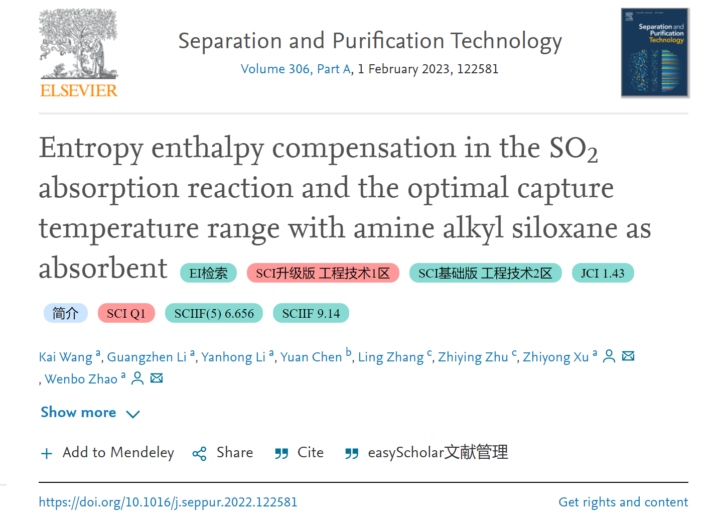 近日,赵文波教授课题组在SO2捕集方面的最新研究成果“Entropy enthalpy compensation in the SO2absorption reaction and the optimal capture temperature range with amine alkyl siloxane as absorbent”在化工领域国际Top学术期刊Separation and Purification Technology上发表。论文的第一作者为我院2020级硕士研究生王凯,通讯作者为赵文波教授,通讯单位为色漫