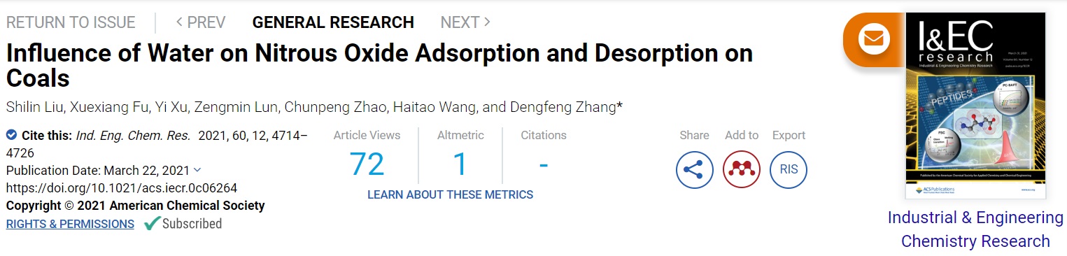 相关成果以“Influence of Water on Nitrous Oxide Adsorption and Desorption on Coals”为题发表于国际化工三大期刊Industrial & Engineering Chemistry Research上。论文的第一作者为我院2018级硕士研究生柳仕林,通讯作者为张登峰教授,通讯单位为色漫