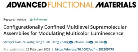 生物质化工团队与南开大学化学学院刘育教授团队合作,在用于多色发光调制多级超分子组装体的研究方面取得重要进展,相关成果“Configurationally Confined Multilevel Supramolecular Assemblies for Modulating Multicolor Luminescence”在材料科学领域权威学术期刊《Advanced Functional Materials》发表(中科院双一区TOP期刊,IF=19.924,论文链接DOI:10.1002/adfm.202300779)。论文的第一作者为我院2021级硕士研究生田梦笛,第一通讯作者为我院张恒高级实验师,第一通讯单位为色漫