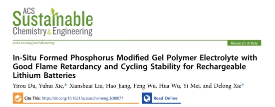 上述研究成果以“In-Situ Formed Phosphorus Modified Gel Polymer Electrolyte with Good Flame Retardancy and Cycling Stability for Rechargeable Lithium Batteries”为题发表在化学工程领域Top学术期刊ACS Sustainable Chemistry & Engineering上, 论文第一作者为磷化工团队2020级博士研究生杜依柔,色漫