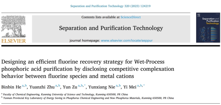 上述研究成果以《Designing anefficient fluorine recoverystrategy for wet-process phosphoric acid purification by disclosing competitive complexation behavior between fluorine species and metal cations》为题发表在化工领域TOP学术期刊《Separation and Purification Technology》上。色漫 为论文第一署名单位,博士研究生何宾宾为论文第一作者,梅毅教授和祖运副教授为论文共同通讯作者,该研究工作得到了国家自然科学基金、云南省基础研究项目基金,云南省“兴滇英才支持计划”青年人才专项以及云南省磷化工节能与新材料重点实验室平台的资助。
