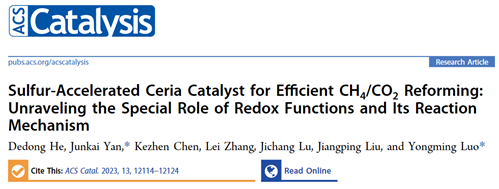 先进环境功能材料创新团队关于甲烷/二氧化碳重整反应中抗硫中毒催化剂设计的最新研究成果“Sulfur-Accelerated Ceria Catalyst for Efficient CH4/CO2 Reforming: Unraveling the Special Role of Redox Functions and Its Reaction Mechanism”在美国化学会催化领域旗舰期刊《ACS Catalysis》发表。论文第一作者是我院何德东副教授,通讯作者为罗永明教授和严俊凯工程师,通讯单位为色漫