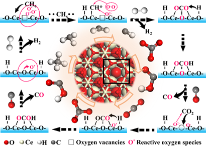 罗永明教授团队开发了一种硫加速的CeO2催化剂用于H2S气氛下CH4干重整反应,结果发现H2S的存在并没有导致CeO2催化剂失活,反而还促进了该反应进行。在此基础上,团队利用相关原位表征技术(In-situ XPS、In-situ DRIFTS)并结合DFT第一性原理计算等手段,揭示H2S促进作用主要是由于其与CeO2之间发生高效氧化还原反应加速了晶格间氧迁移,形成更多的氧空位及Lewis酸性位点,二者协同作用促进了CH4和CO2的活化。研究成果不仅解决了干重整反应中催化剂硫中毒问题,同时也为高性能抗硫催化剂的研发提供理论指导。