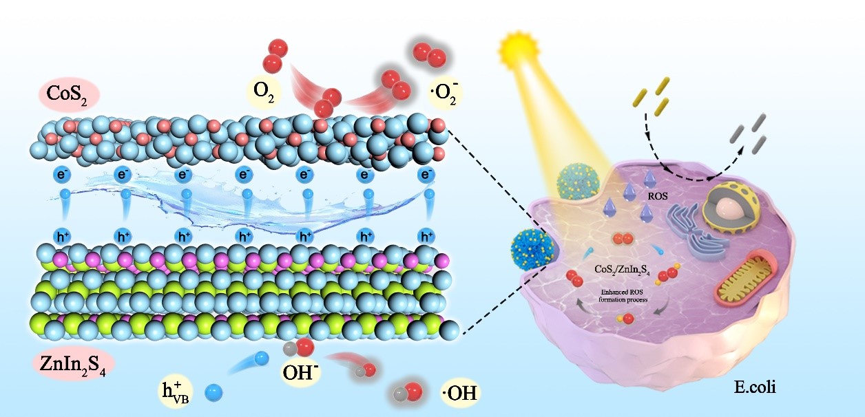 受助催化剂耦联改性半导体在可见光驱动催化技术中拥有优异性能的启发,采用二次水热法利用助催化剂CoS2耦联半导体ZnIn2S4构建肖特基异质结进行材料重构,探究具有强大内置电场和丰富表面活性位点的微晶材料的可见光驱动催化抗菌机理。CoS2/ZnIn2S4二者构建较强界面耦合,有效地抑制了光生电子/空穴对的复合,驱动电子定向快速转移增强其可见光驱动抗菌效果。该研究为优化此类新型硫系抗菌材料结构设计和高效细菌灭活机理开辟了新的研究思路(论文连接:DOI: 10.1016/j.jcis.2023.09.118)。