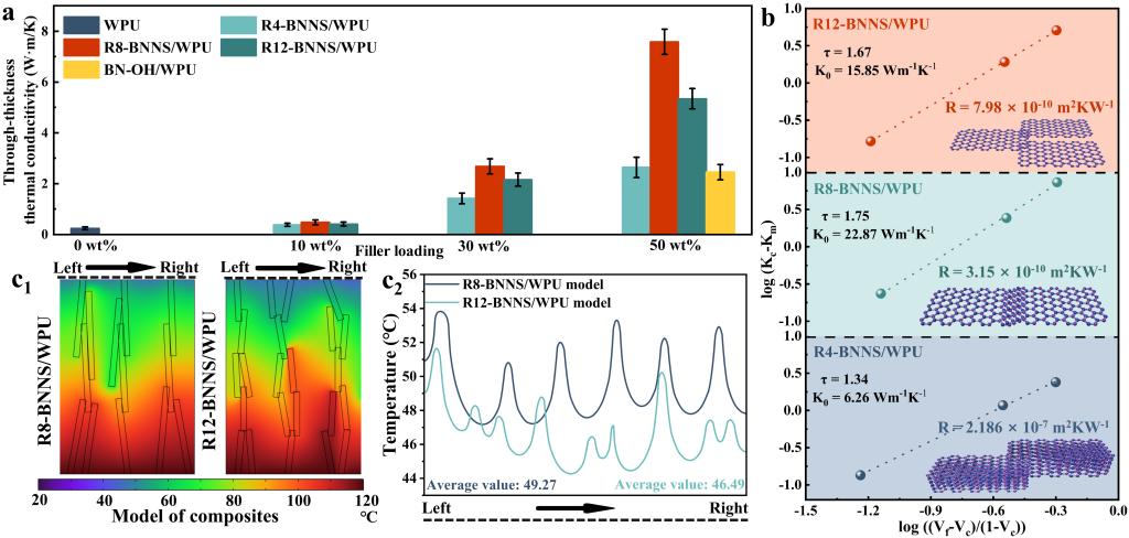 近日,色漫 磷化工团队通过碱辅助水热处理与高速剪切相结合,实现了2.54 nm厚度氮化硼纳米片(BNNS)的规模化高产率(65%)剥离。同时,成功在氮化硼纳米片引入羟基官能团,使其适用于水性聚氨酯(WPU)中,制备了导热柔性薄膜,在50 wt%BNNS添加量下导热率提高了30倍,达到了7.58 W/m·K的垂直方向导热率。该薄膜表现出优异热稳定性、拉伸强度和火安全性能,可被用作大功率LED的热界面材料,对比商用硅脂表现出更好的热管理能力。结合Comsol仿真导热模拟和Foygel理论计算,重点研究了不同大小、厚度BNNS之间的界面热阻,揭示了BNNS导热增强的尺寸相关性。该研究为可控氮化硼纳米片的剥离和高效热管理复合材料的设计提供了新的方法和理论指导。