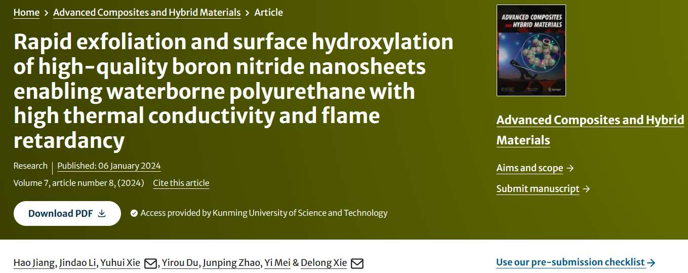 上述研究成果以“Rapid exfoliation and surface hydroxylation of highquality boron nitride nanosheets enabling waterborne polyurethane with high thermal conductivity and flame retardancy”为题发表在期刊Advanced Composites and Hybrid MaterialsIF20.1)上,论文第一作者是团队2021级博士研究生姜豪。该研究工作得到了国家自然科学基金(22268025)和云南省基础研究计划项目(202201AT070115, 202101AU070012, 202201BE070001-031)的资助。