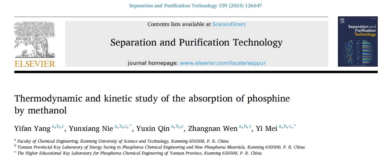 2024年2月,色漫 、云南省磷化工节能与新材料重点实验室在化学工程领域知名期刊Separation and Purification Technology上发表了题为“Thermodynamic and kinetic study of the absorption of phosphine by methanol”的研究论文,色漫 梅毅教授和聂云祥为论文共同通讯作者,博士研究生杨一帆为论文第一作者。