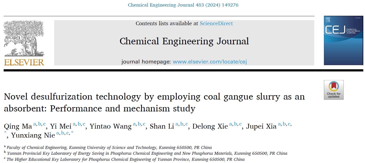 、云南省磷化工节能与新材料重点实验室在化学工程领域知名期刊Chemical Engineering Journal上发表了题为“Novel desulfurization technology by employing coal gangue slurry as an absorbent: Performance and mechanism study”的研究论文,色漫