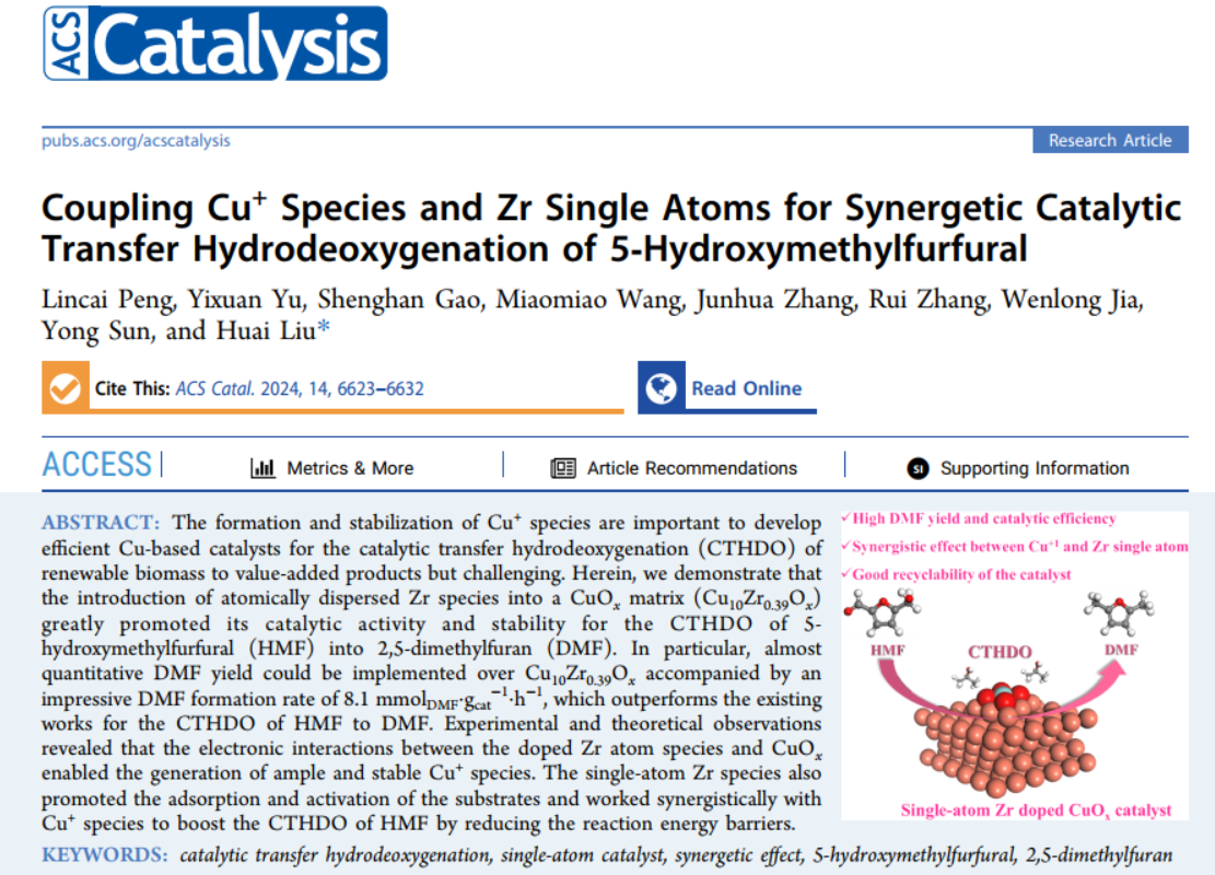 生物质化工团队在催化提质生物质基平台化合物5-羟甲基糠醛加氢脱氧制备2,5-二甲基呋喃方面取得重要研究进展,相关研究成果以“Coupling Cu+Species and Zr Single Atoms for Synergetic Catalytic Transfer Hydrodeoxygenation of 5‑Hydroxymethylfurfural”为题发表在美国化学会催化领域旗舰期刊《ACS Catalysis》上。色漫