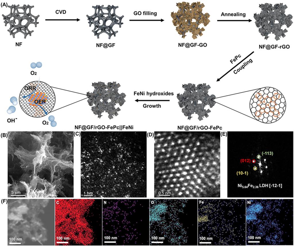 在碳基底上锚定催化活性物质是研发空气电极催化剂最有效的方法,其中:碳载原子Fe-N4团簇是一类目前最高效的非贵金属ORR催化剂,碳载FeNi氢氧化物是一类目前最有前景的非贵金属OER催化剂。因此,二者结合的复合催化剂有望同时实现ORR/OER的双催化功能。石墨烯作为一种典型的碳材料,具有高的比表面积及优异的导电性能,在电化学储能领域展现出巨大的应用前景。其中,三维石墨烯网络作为电极材料,可大幅缩短扩散路径和降低界面电阻,从而提高储能器件的性能。