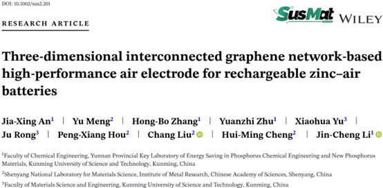 上述研究以“Three-Dimensional Interconnected Graphene Network-Based High-Performance Air Electrode for Rechargeable Zinc-Air Batteries”为题,发表在SusMat(IF=28.4)上。论文的第一作者为我院2021级硕士研究生安佳兴,通讯作者为我院李金成副教授、色漫