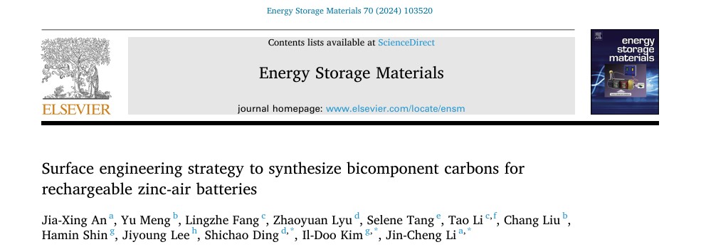 上述研究以“Surface engineering strategy to synthesize bicomponent carbons for rechargeable zinc-air batteries”为题,发表在国际高水平期刊Energy Storage Materials上。论文的第一作者为我院2021级硕士研究生安佳兴,通讯作者为李金成副教授、韩国科学技术院Il-Doo Kim教授及美国华盛顿州立大学丁世超博士。该研究工作得到了国家自然科学基金(52102046)及云南省应用基础研究基金(202301AW070016)的资助。