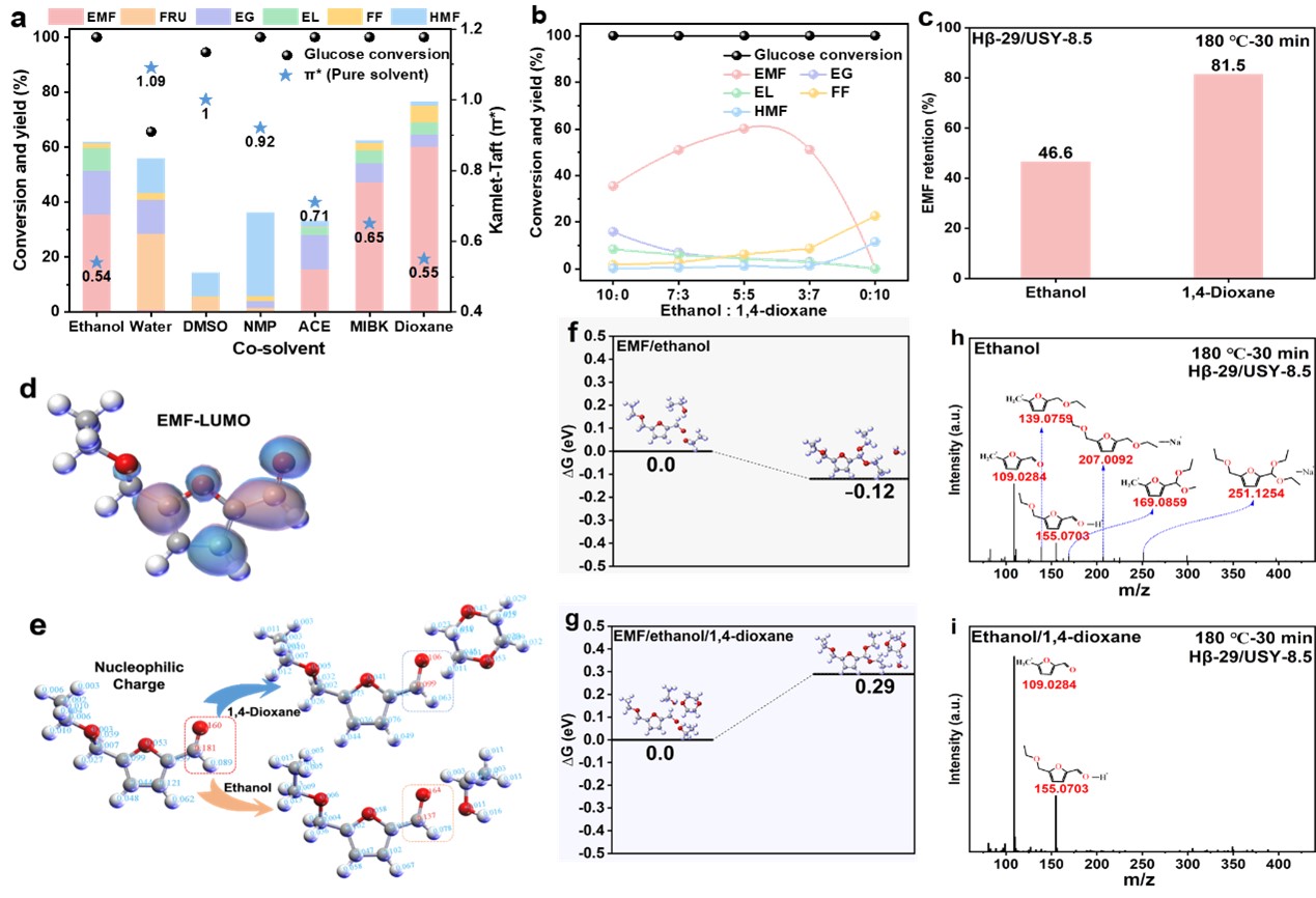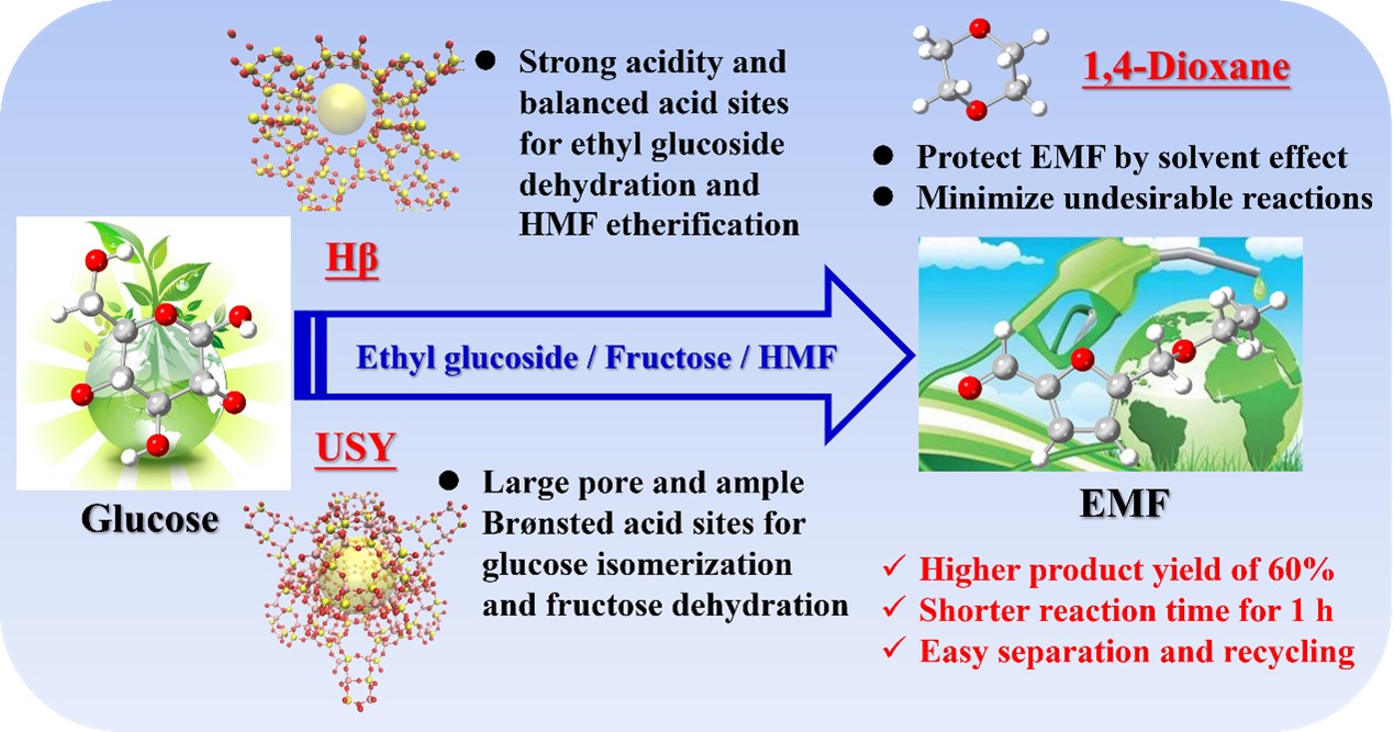 基于此背景,生物质化工团队利用接力催化和溶剂效应协同机制,创新开发了一种基于1,4-二氧六环共溶剂介导的多功能复合沸石分子筛催化反应体系,可使葡萄糖直接高效转化成5-乙氧甲基糠醛,产物得率突破60%,且反应后催化剂和溶剂易与产物分离并具优良的可回收重复使用性能。研究发现:Hβ和USY沸石分子筛的组合能理性调控催化剂的化学空间、酸性和酸位点,协同促进葡萄糖串联催化反应的有效接力进行,其中含强酸性和丰富L酸位点的Hβ沸石分子筛非常有利于中间产物葡萄糖苷脱水和5-羟甲基糠醛醚化反应步,而具大孔结构和丰富B酸位点的USY沸石分子筛可明显提升葡萄糖异构化和果糖脱水的反应效率。同时研究表明:1,4-二氧六环共溶剂的引入能显著降低目标产物5-乙氧甲基糠醛进一步遭受体系的亲核攻击,以免导致不良的副反应,从而达到有效稳定产物5-乙氧甲基糠醛的连续生成。该研究不仅创新发展了一种直接利用生物质葡萄糖制备生物燃料5-乙氧甲基糠醛的高潜力途径,而且深刻阐明了反应过程中多功能复合沸石分子筛的催化作用机制和1,4-二氧六环共溶剂的介导效应机理,可为生物质能源化高值高效利用提供基础理论支撑与技术参考。