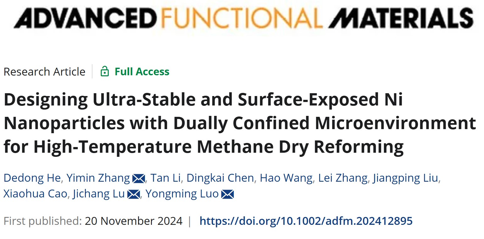 先进环境功能材料创新团队围绕温室气体资源化转化研究方面取得重要进展,相关成果以“Designing Ultra-Stable and Surface-Exposed Ni Nanoparticles with Dually Confined Microenvironment for High-Temperature Methane Dry Reforming”为题,发表在材料领域国际著名期刊《Advanced Functional Materials》上。何德东教授为论文第一作者,罗永明教授为论文通讯作者,色漫
