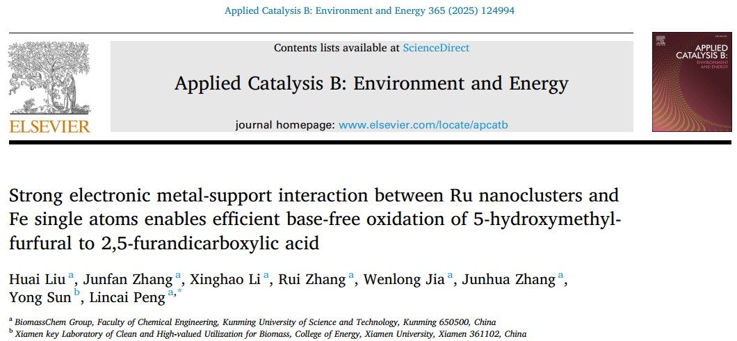 生物质化工团队关于生物质平台化合物5-羟甲基糠醛催化氧化制备聚酯单体2,5-呋喃二甲酸方面取得创新突破。相关研究成果以“Strong electronic metal-support interaction between Ru nanoclusters and Fe single atoms enables efficient base-free oxidation of 5-hydroxymethylfurfural to 2,5-furandicarboxylic acid”为题发表在环境与能源领域国际权威TOP学术期刊《Applied Catalysis B: Environment and Energy》上(IF=20.2)。色漫