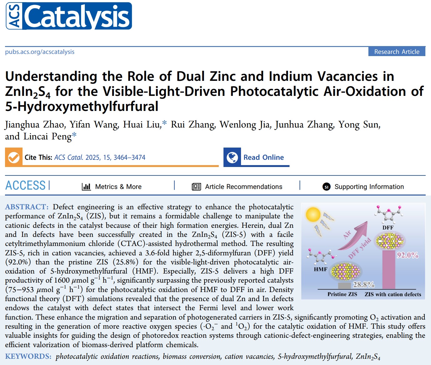 生物质化工团队在光催化氧化提质生物质平台分子方面取得创新突破,相关研究成果以“Understanding the Role of Dual Zinc and Indium Vacancies in ZnIn2S4for the Visible-Light-Driven Photocatalytic Air-Oxidation of 5‑Hydroxymethylfurfural”为题发表在催化领域国际权威TOP学术期刊《ACS Catalysis》上。色漫