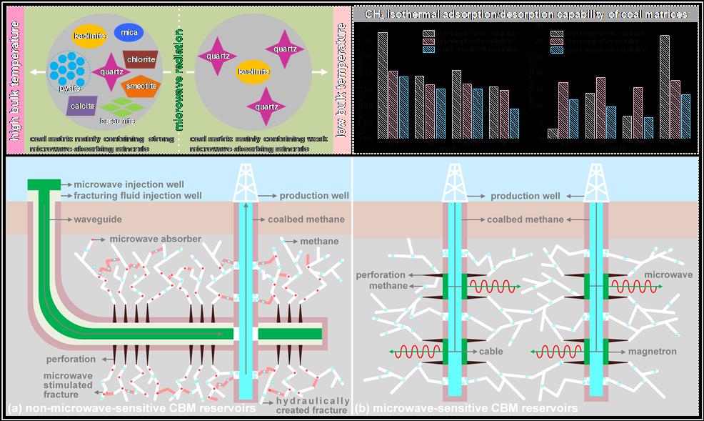 此外,结合我国煤层气开发现状,研发更为清洁、高效和低运行成本的煤层气开采工艺,对于实施我国煤层气“两步走”发展战略以及“双碳”战略目标具有重要意义。微波辐照技术因具有特殊“热效应”和“非热效应”有望同步改造煤层气储层并促进煤层气解吸,进而提高煤层气采收率。为此,该团队测定了与煤基质吸波性能相关的介电参数,并于模拟实际饱水煤层气储层条件下探究了微波辐照对煤基质升温行为、理化性质和CH4吸附/解吸性能的影响。结果表明:(1)煤基质升温行为主要受控于其介电特性及矿物组成;(2)水分提升了煤基质前期升温速率,降低了最终体相温度;(3)微波辐照降低了煤基质芳香性及含氧官能团含量,水分对此趋势有抑制作用;(4)微波辐照前后煤基质CH4吸附/解吸性能主要取决于其孔隙结构对微波的响应规律。综上,微波辐照技术有望于实际饱水储层增采煤层气。