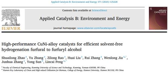 生物质化工团队在半纤维素基糠醛催化加氢制备糠醇方面取得重要研究进展,实现了无溶剂条件下糠醛的高效选择性加氢。相关研究成果以“High-performance CuNi-alloy catalysts for efficient solvent-free hydrogenation furfural to furfuryl alcohol”为题发表在环境与能源领域国际权威TOP期刊《Applied Catalysis B: Environment and Energy》上(IF=20.2)。色漫