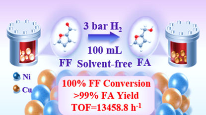 基于此,生物质化工团队构建了一类高效NiCu合金催化剂,可在无溶剂和温和条件(110 ℃、0.3 MPa H2)下,使糠醛选择性加氢生成糠醇。其中,Cu1Ni1Ox/C催化剂的转换效率TOF值高达13458.8 h⁻1,显著优于已报道的反应体系(<6273 h⁻1)。同时,当反应体系放大至100 mL时,糠醇产率仍保持在99%以上,显示出优良的工业应用前景。机理研究表明:Ni0(111)晶面主导H2均相解离及糠醛的η²(O)-醛模式吸附,而铜掺杂使催化剂d带中心上移,优化底物吸附构型和降低反应能垒,它们之间的合金效应增强活性位点稳定性。进一步研究发现,该催化剂具有广谱适用性,可拓展至多种醛酮衍生物的无溶剂加氢反应。该研究工作从电子结构调控角度深化了对CuNi合金催化剂界面作用机制的认识,并为用于醛酮化合物无溶剂氢化的高效催化剂设计提供了科学依据。