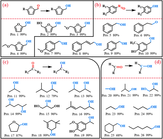 糠醛是工业成熟的大宗生物基平台化合物,可由木质纤维原料(如玉米芯、蔗渣)半纤维素经水解和脱水制备。2023年,全球糠醛年产量超过30万吨,市场规模达5.95亿美元,而我国已成为全球最大的糠醛生产和出口国,产能约占全球的70%。目前,全球约80%的糠醛都用于制备糠醇,它是一种重要的生物基工业原料,主要用于生产糠醛树脂、呋喃树脂、糠醇-尿醛树脂、酚醛树脂等,同时在染料、合成纤维、橡胶、农药和铸造等工业领域有广泛应用。目前糠醇工业化生产主要通过糠醛气相或液相催化加氢制得,反应通常需在高压氢气条件下或有机溶剂中进行,生产过程效率有待进一步提升。