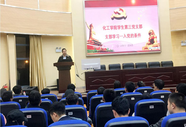 2018年11月5日20:00-20:30,化工学院学生第三党支部在化工楼100报告厅开展 “党课—入党的条件”学习。党支部入党积极分子和所有党员50余人参加了学习,主讲教师为党支部书记袁敬老师。