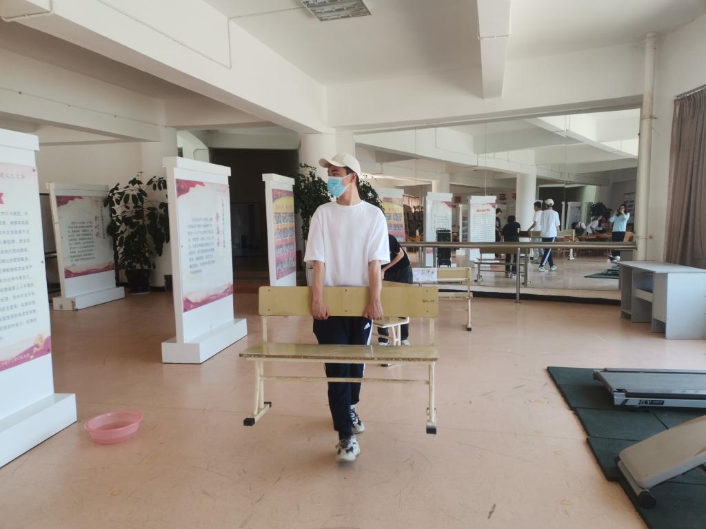 活动中,学生党员们分工合作,男生党员四人一组,负责整理三楼平台的柜子和桌椅。女生党员用自己带来的扫帚、抹布、拖把等劳动工具相互配合,分别清扫门窗、镜子、桌椅、地板等。