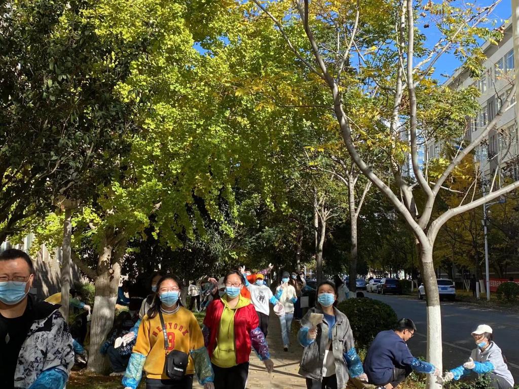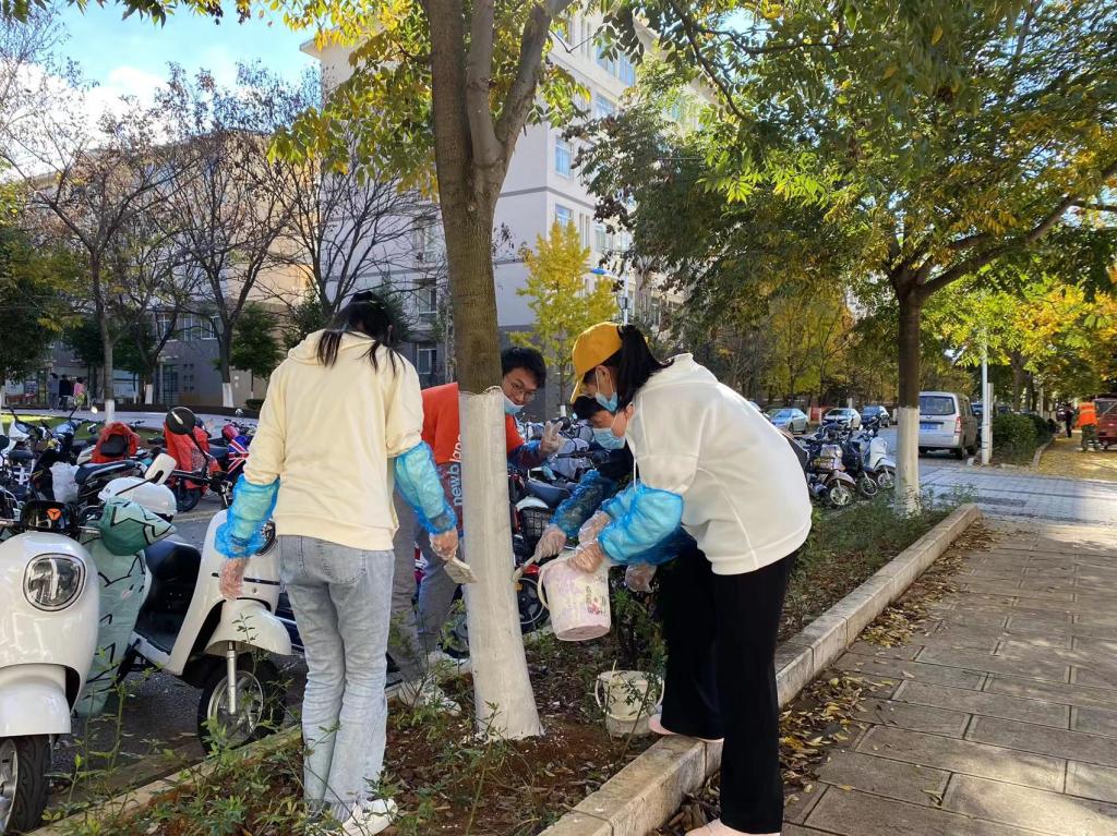 活动中,在绿化工作人员的指导下,党员、积极分子们严格按照树木刷白的流程和标准,依次给怡园学生社区树木进行刷白。在同志们团结互助、齐心协力的努力下,树木齐刷刷穿上“新衣”。