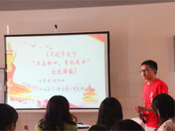 吕涛同学为大家分享中国交通发展史,周世浩同学带领大家学习《中国共产党党内重要法规汇编》,余毓兰、余俊伟同学相声《理科生》表演,苏秋萍同学带领大家学习《习近平新时代中国特色社会主义思想学习纲要》,欧阳明同学带领大家学习《习近平关于“不忘初心,牢记使命”重要论述选编》。