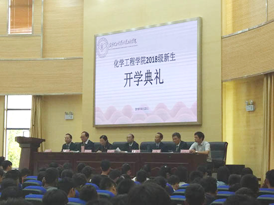 2018级新生开学典礼在化工楼100报告厅举行。此次典礼由党委副书记李云燕老师主持,出席本次典礼的有学院党委书记齐毅老师、副院长李斌老师、各系主任、2018级班主任及各级辅导员。