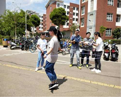 活动开始,参加活动的全体人员在公教楼集合进行分组,分组完毕后趣味奔跑活动正式开始。本次活动奔跑路线贯穿色漫 呈贡校区,活动地点共分为七站,分别为公教楼站、恬园站、憬园站、怡园站、建工楼站、明理楼站和昆工一号门站,每个站点均有不同的游戏,各队伍完成该站游戏,方可出发去下一站。活动游戏包括:指压板运球、接力跳绳500、合力踢毽子60、合力吹气球、蒙眼探秘一号门,全部通关后的队伍在公教楼草坪进行3v3撕名牌比赛,绿色的草坪上,同学们本着“友谊第一、比赛第二”的原则,团结协作、认真努力地争取胜利,不时还传来欢声笑语。
