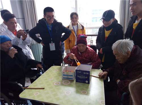 活动开始大家和老人们一起做游戏,包括用筷子夹乒乓球和比划猜词,期间不时传来大家的欢笑声,游戏优胜者还获得准备好的小礼品。之后大家耐心、热情地与老人们聊天,认真地教老人们老年手指操。手指操是一个有益健康的日常小活动,志愿小分队专心致志地教学,老人们也认真地学习。在一系列活动后,老人们有点累需要休息,于是大家来到房间里和活动稍有不便的老人聊天。欢乐的时光总是过得很快,大家在养老院前一起留影后,整个活动迎来了尾声。