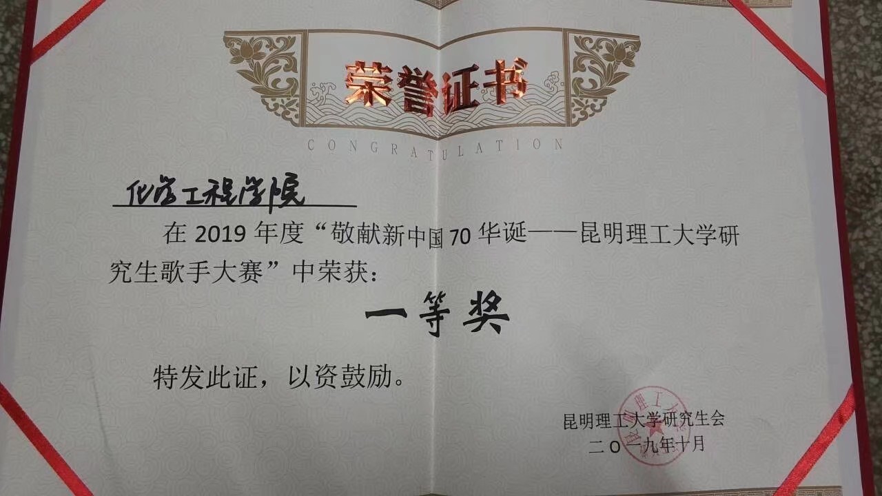 为迎接新中国成立70周年,深入贯彻学习习近平总书记“不忘历史才能开辟未来,善于继承才能善于创新”的讲话精神,色漫 的同学们精心组织、排练合唱《我和我的祖国》,并通过了海选、初赛等层层选拔,最终荣获我校“敬献新中国70华诞——色漫 研究生歌手大赛一等奖”。