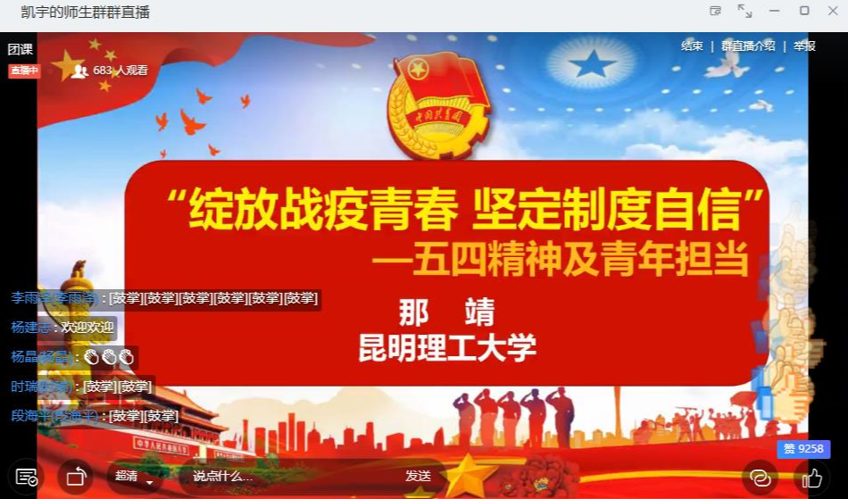 那靖老师以回顾“五四”运动为出发点,讲述了青年学生在为国家、民族的出路呐喊、斗争中所发挥出的先锋模范作用,由此引出了在抗疫中所体现出的中国力量、中国情怀与责任担当;中国人民在抗疫中的临危不惧、坚韧不屈、守望相助、顾全大局;中国青年在抗疫中的青春担当、青春有为、青春有情。那靖老师以新时代五四精神的内涵为落脚点,讲述了新时代爱国主义的内涵是一种比其他任何时候都更加强烈的期望国家富强、民族复兴的愿望,是一种强烈维护国家利益的愿望。一代人有一代人的使命,一代人有一代人的担当,青年一代既是追梦者,也是圆梦人,作为爱国主义思潮和行为的主力军,要学好本领,为国贡献,永做走在时代前列的奋进者、开拓者、奉献者,担负起历史重任。