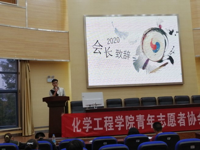 首先,主持人宣布全体起立,共唱《志愿者之歌》,随后,上届会长褚永鑫同学发言,褚永鑫同学回顾了上一届志愿者协会开展的工作。