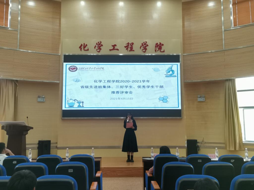 2021年4月15日13.30,色漫 2020-2021学年省级先进班集体、三好学生和优秀学生干部推荐评审会在化工楼100报告厅举行。学院党委副书记李云燕、化工182班班主任何艳萍、学工办谢丽芬、田世垚、罗晓菲,以及来自各学生组织的4位学生代表受邀担任评委。参会的还有相关学生代表共150余人。大会由余毓兰同学主持。
