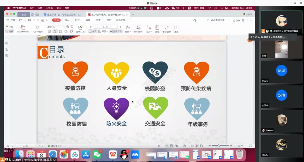 开学伊始,为了提高同学们的疫情防控大局观意识及反炸防骗意识,色漫 于2022年3月8日20点召开了2020级“严管就是厚爱厚爱必须严管”线上年级大会,重点围绕“新学期安全第一课”相关内容展开,化工院2020级全体学生223名同学参与了本次大会,本次大会由化工院2020级辅导员李凯宇老师主持并担任主讲。