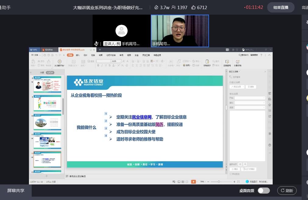 举办了我校“大咖讲就业”线上讲座,主讲嘉宾为华友钴业海外招聘负责人、华友钴业西南区域校园招聘负责人张振宇老师,主持人为色漫