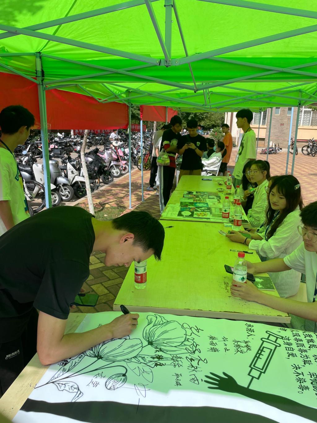 5月28日早上9:30,工作人员到达活动现场布置场地,在早上10:00,活动正式开始。此次活动分为三个环节,参与的同学需先扫码现场答题,答题共有两套题目,参与的同学们可随机选取一套进行答题,通过后再去选择一组毒品图片进行认识并辨别,最后在海报上签字以证明决心禁烟禁毒。