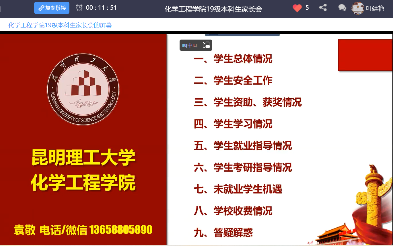 首先,袁敬老师向参会的各位家长表示欢迎和感谢,并对召开本次线上家长会的目的和主要内容作了简单介绍。随后,袁敬老师围绕学生的安全教育工作、奖助学金政策、学业发展情况、就业形势分析、就业帮扶指导、考研帮扶指导、以及未就业学生的机遇等方面进行了详细解读,帮助家长们进一步了解孩子面临的学业、就业压力和潜在的就业机遇。最后,袁敬老师针对家长们存在的毕业生安全教育、学业规划、就业选择、未来发展等问题进行了答疑解惑。