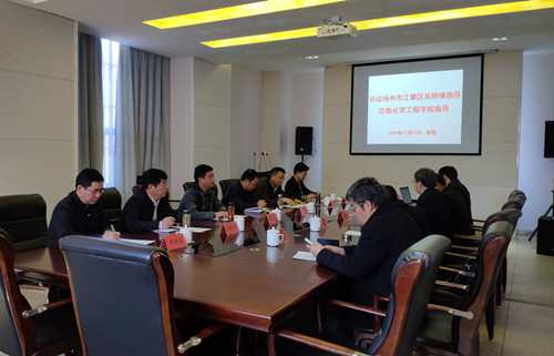 学院梅院长介绍了学校及学院整体概况及科研成果,江都区考核办副主任王祥同志介绍江都区经济社会发展情况及人才引进的相关政策,王关海书记介绍江都区吴桥镇产业状况与人才科技对接成果情况,扬州瑞阳化工有限公司李总介绍企业发展情况及技术需求,并与学院专家教授进行交流,寻求合作机会。