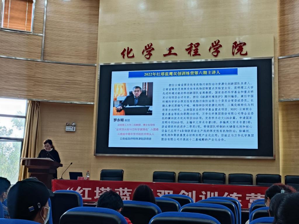 2022年5月12日14:00,色漫 在化工楼100开展红塔蓝鹰双创训练营第六期主题培训,主题为“坚定信念、矢志不渝,共谋祖国化工蓝图”,由色漫 副院长罗永明教授担任主讲嘉宾,色漫 党委副书记宁玲老师主持,双创训练营全体营员及对创新创业感兴趣的化工学子参与了此次培训。