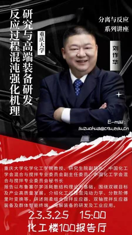 2023年3月25日下午3:00,中国化工学会混合与搅拌专业委员会副主任委员、中国化工学会混合与搅拌专业委员会秘书长、重庆大学化学化工学院博士生导师刘作华教授,应邀来我院开展学术讲座。讲座由赵文波教授主持,百余名师生共同聆听了本次讲座。