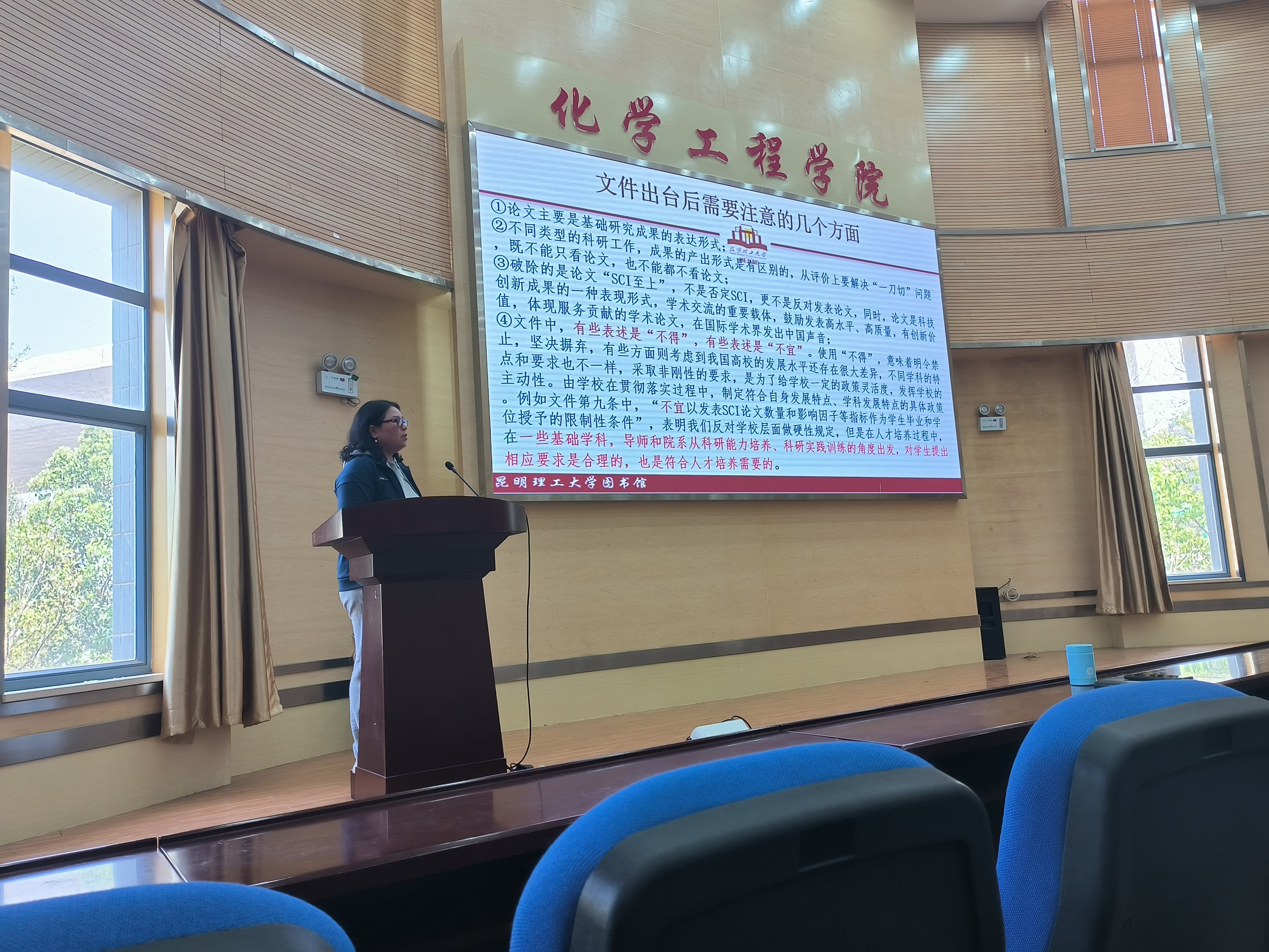 会上,杨婷老师首先向参会的老师和研究生们解读了科技部发布的规范高等学校SCI论文相关指标的政策,然后从国家、国内、我校及我院四个维度,对高校基础研究情况及表现进行了详细分析。指出了我院在我校基础研究方面做出的贡献以及存在的不足,并建议我院要从加大校外高质量科研合作力度、制定相关激励机制与考核机制、加强学科交叉研究等方面来扩大学院影响力和进一步提高学院基础研究贡献度。