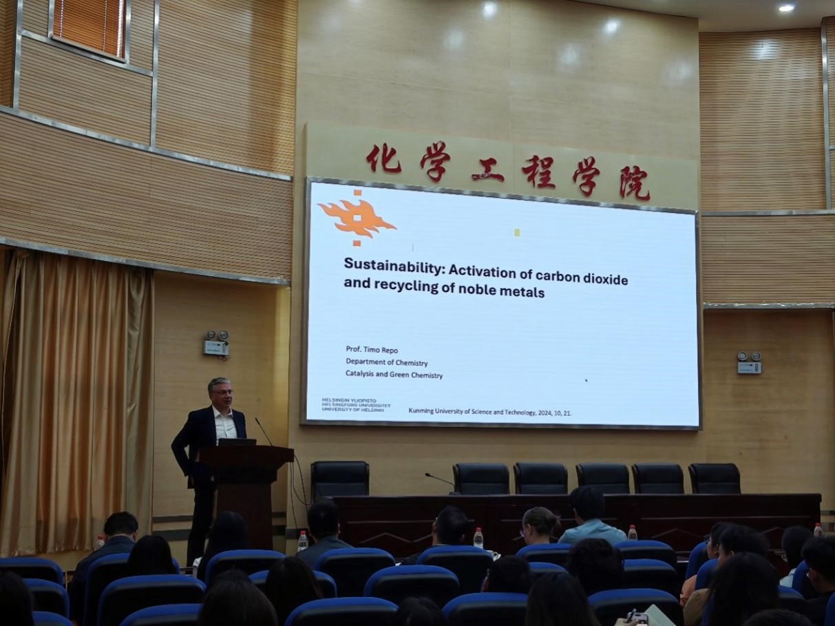 首先,Timo Repo教授作了题为“基于可持续发展的绿色CO2小分子活化和贵金属回收”的学术报告,报告由色漫 院长罗永明教授主持,我院师生聆听了本次讲座。Repo教授从可持续发展的角度出发,重点介绍了C-O键的活化以及CO2的利用途径,同时介绍了温和氧化法回收贵金属的绿色路径。报告有助拓宽师生学术视野、激发创新思维,部分师生就相关主题与Repo教授进行了交流与讨论。