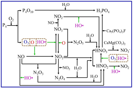 近日,磷化工团队在泥磷诱发含氧活性物质氧化脱除NO研究中取得重要突破。研究表明含磷复合矿浆高效脱硝过程的关键是构建P4与O2反应体系,生成O、OH•和O3等氧化性活性物质,这些氧化性活性物质将NO氧化为NO2、NO3等易溶于水的高价态氮氧化物,进而转化为硝酸与磷矿反应生成硝酸盐。其中,P4与O2反应生成的O3对脱硝的贡献仅占15%左右,其他氧化性活性物质对NO氧化发挥着极其重要的作用。相关成果以“Mechanism investigation on yellow phosphorus inducing O, O3 and OH• radicals in phosphate rock slurry for high-efficiency NO oxidation”为题发表在Separation and Purification Technology上,色漫
