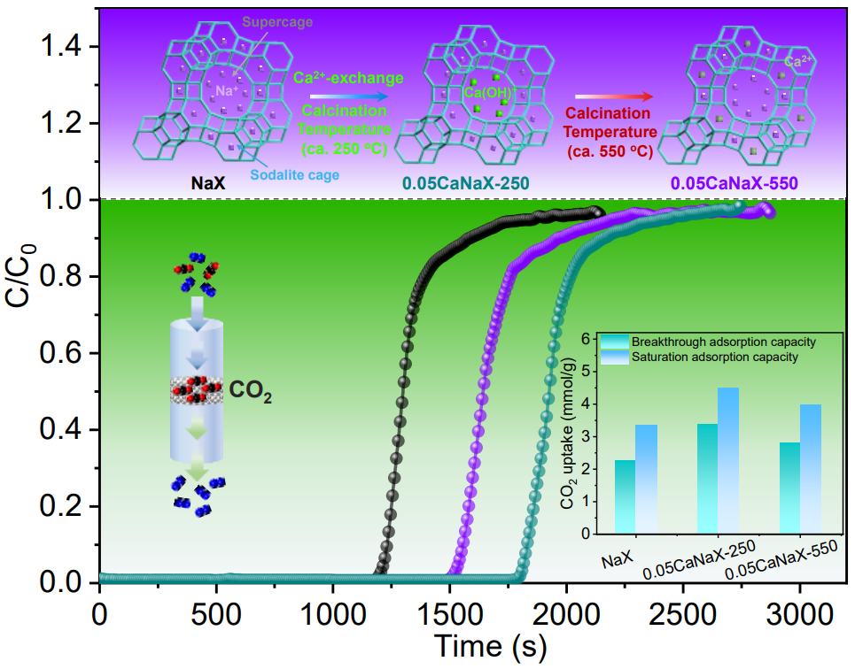 磷化工团队提出一种“低温焙烧温度”策略构筑吸附活性物种精准落位的新型CO2分子筛吸附剂。其核心思想是利用FAU型分子筛中阳离子的可迁移性,通过调变焙烧温度和Ca2+阳离子的交换度来最大限度地利用CaNaX分子筛超笼中“羟基化钙物种”吸附位点,以实现CO2的高效捕集。该工作打破传统高温焙烧制备CO2分子筛吸附剂的传统理念,通过更加温和焙烧条件精确构筑了有效吸附活性位点的同时,大大降低了制备过程中的能耗和成本。通过各项表征证明,所研发的0.05CaNaX-250分子筛吸附剂保证了每个FAU晶胞结构中至少有21个羟基化钙物种在其超笼中落位(接近理论最大值),其具有较高的CO2吸附量(穿透吸附量:3.37mmol/g、饱和吸附量:4.54mmol/g)。同时还具有快速的吸附动力学和较低的吸附热。在CO2/N2和CO2/CH4竞争吸附中,其选择性分别达到156.8和11.5。经过10次循环再生后,仍然保持着高度的可回收性,优于其他文献所报道的FAU分子筛吸附剂。此外,通过原位CO2吸附红外光谱技术进一步地揭示了低温焙烧样品的CO2吸附机理,并表明了其优异的CO2吸附性能得益于Ca(OH)+∙∙∙(CO2)2物种(羟基化钙物种)的形成。这项工作对于更好地理解阳离子在FAU分子筛中的作用具有重要意义,同时也为其他优异的CO2分子筛吸附剂中有效吸附位点的定向设计提供了重要的参考价值。