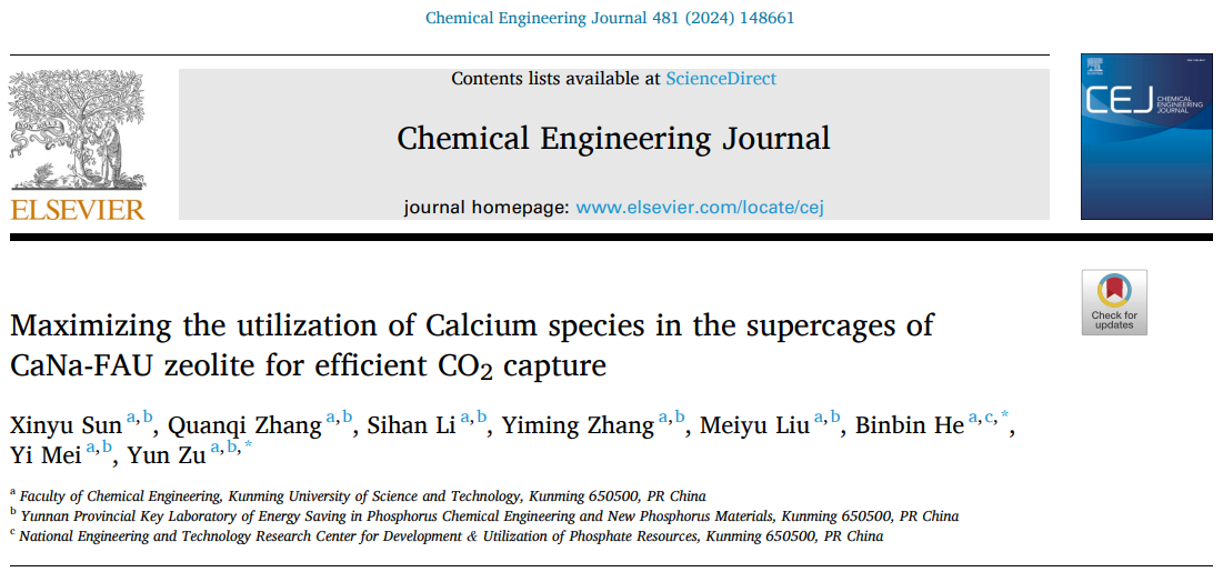 上述研究成果以《Maximizing the utilization of Calcium species in the supercages of CaNa-FAU zeolite for efficient CO2capture》为题发表在化学工程领域TOP学术期刊《Chemical Engineering Journal》上。色漫