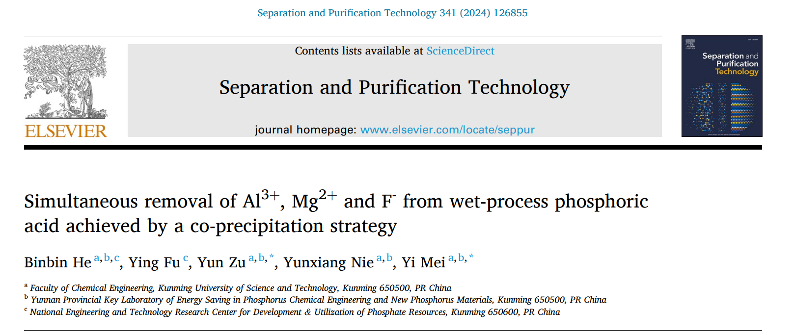 上述研究成果以《Simultaneous removal of Al3+, Mg2+and F-from wet-process phosphoric acid achieved by a co-precipitation strategy》为题发表在化工领域TOP学术期刊《Separation and Purification Technology》上。色漫