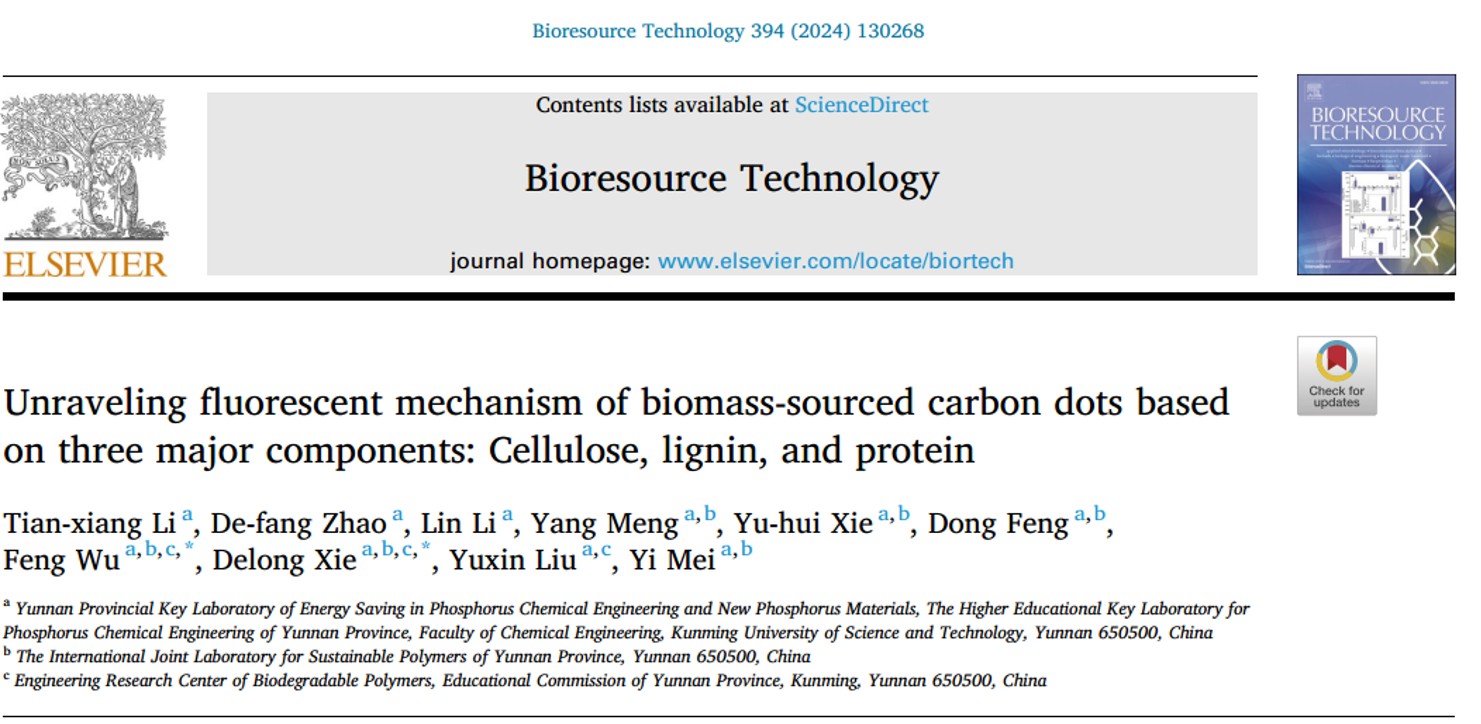 上述研究成果以“Unraveling fluorescent mechanism of biomass-sourced carbon dots based on three major components: Cellulose, lignin, and protein”为题发表在知名期刊Bioresource Technology上。论文第一作者为磷化工团队2021级硕士研究生李天祥,通讯作者为谢德龙教授和吴枫讲师,色漫